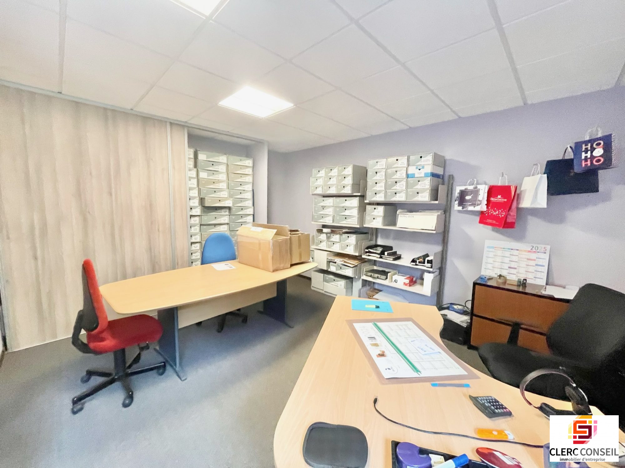 Au 1er étage d'un bâtiment tertiaire, surface de bureaux d'environ 75,28 m2 composée de trois bureaux cloisonnés ainsi que des sanitaires.
