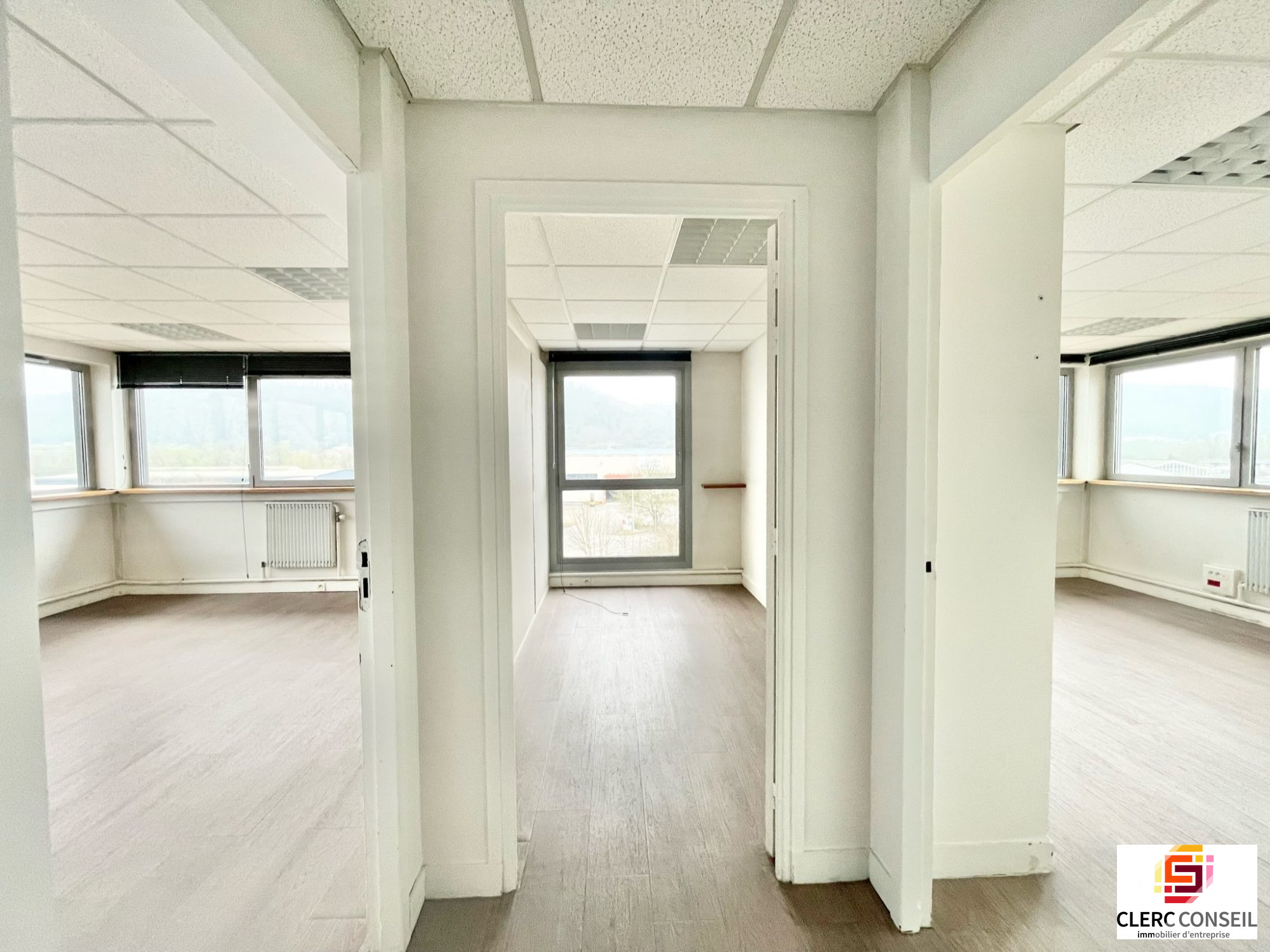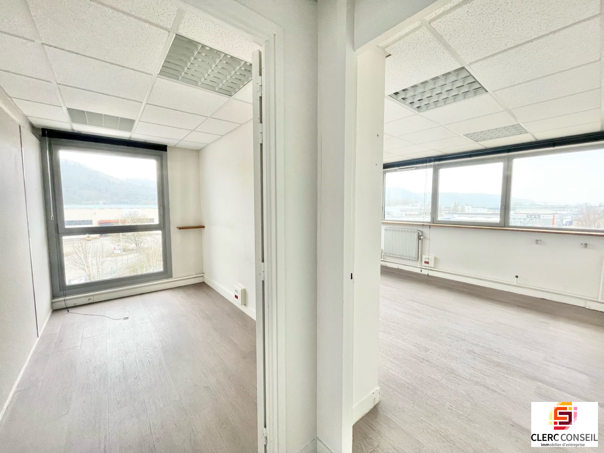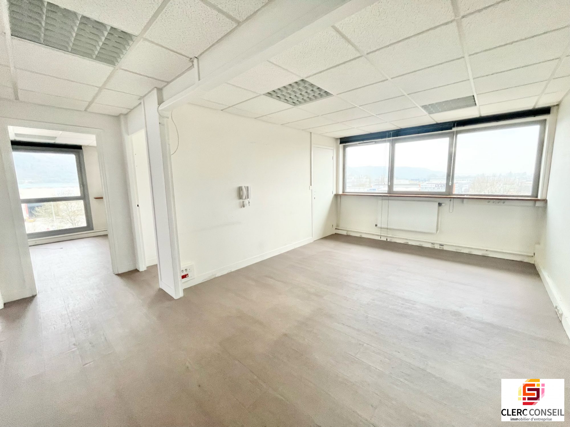 Au coeur de la Zone Industrielle, ensemble de bureaux situés au 2ème étage, d'une surface d'environ 90 m2 composée de 4 bureaux, sanitaires et douches intégrés aux parties communes.