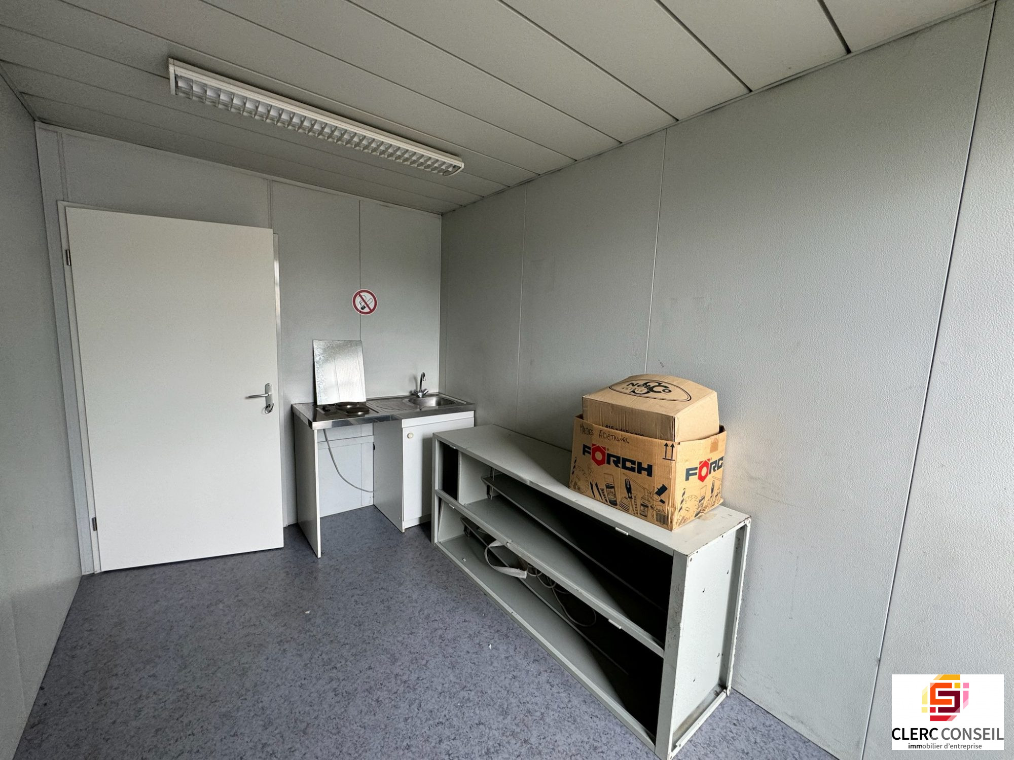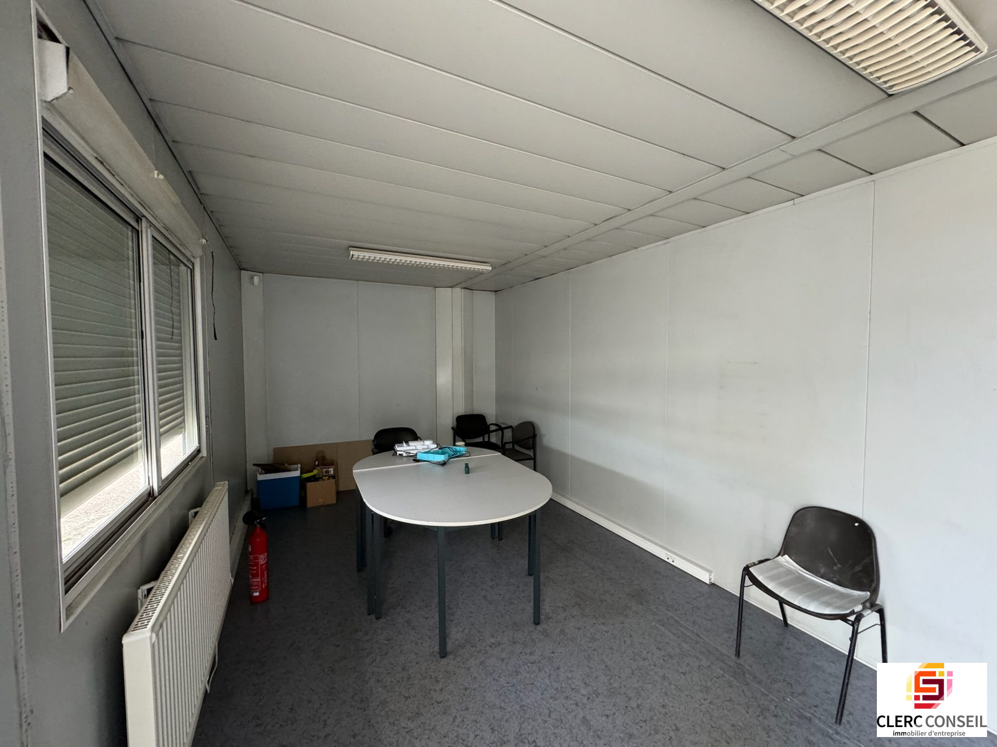 - D'une surface de bureaux modulaires de 75 m2 environ avec un grand accueil, un grand bureau paysagé, deux sanitaires et un petit réfectoire avec WC et accès séparé